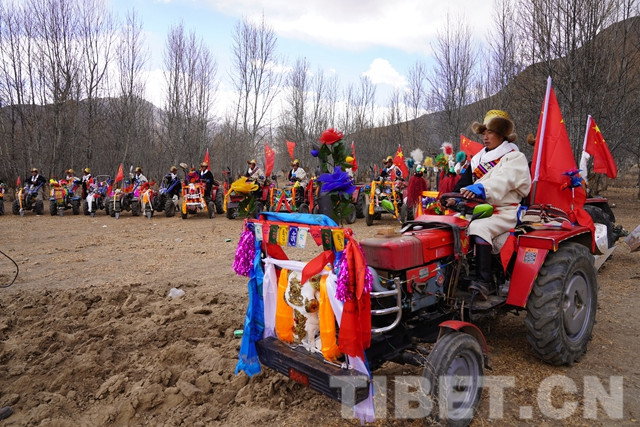 而在克日村的另一塊田地里裝扮的“花枝招展”的18輛“鐵?!币残顒荽l(fā),開犁的第一臺拖拉機更是特別,車頭裝飾除了五彩哈達和花束外還有一牛頭?!耙郧案鞣绞绞嵌LЦ埽F在用拖拉機了,就在車頭前放了牛頭?!备鞣绞降淖冞w、生活的變化并沒有讓他們忘記傳統(tǒng)。