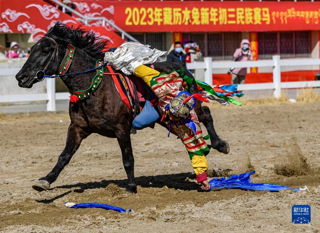 2月23日,騎手表演騎馬拾哈達。新華社記者 張汝鋒 攝